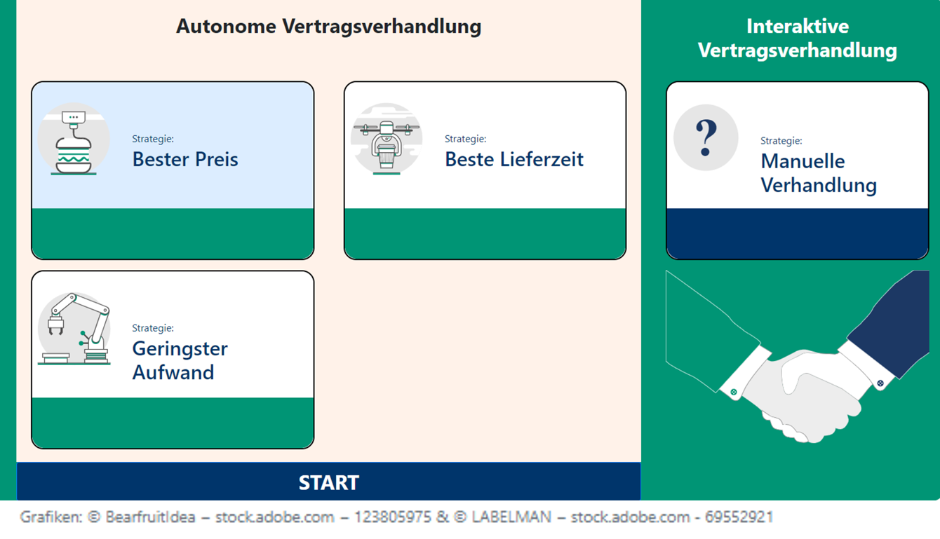 Sie haben nun die Möglichkeit, die Vertragssimulation in einer autonomen oder interaktiven Form durchzuführen. Bei der interaktiven Variante schlüpfen Sie in die Rolle des Softwareagenten und verhandeln selbst schrittweise den Vertrag mit dem Softwareagenten des Logistik-Dienstleisters. Ein Softwareagent ist ein Softwareprogramm, welches zu einem autonomen Verhalten fähig ist und versucht, die spezifizierten Interessen des Betreibers durchzusetzen. Bei der autonomen Verhandlung hingegen wählen Sie einen von drei vorgefertigten Softwareagenten aus, die einer simplen Strategie folgen, und lassen diesen für Sie verhandeln.